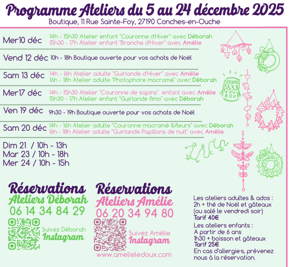 Nous vous attendons du 5 au 24 Décembre dans la merveilleuse boutique « Les Fleurs de Charlotte » au 11 rue Sainte Foy à Conches en Ouche dans l’Eure pour une exposition vente et des ateliers créatifs (adultes, ados et enfants) !